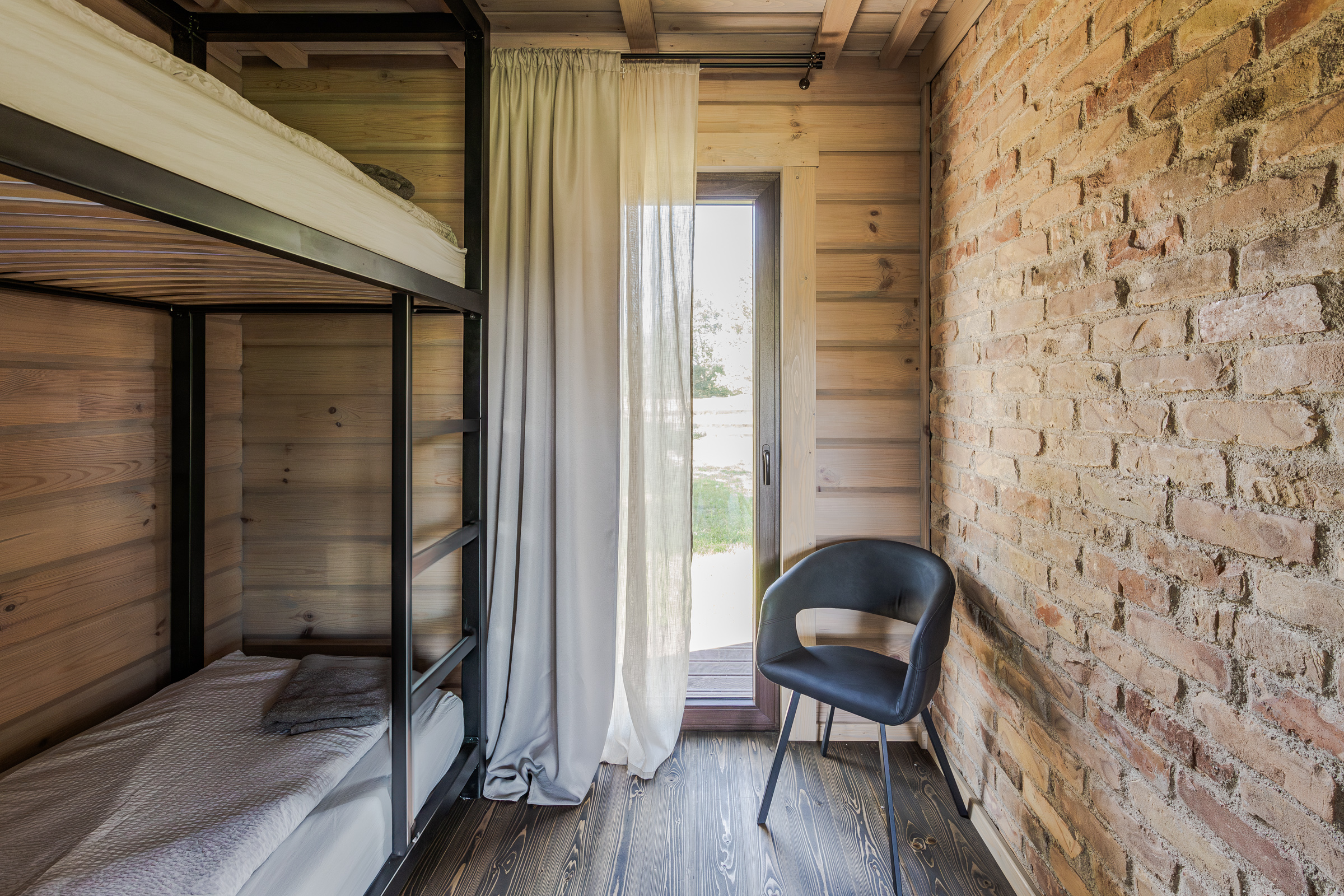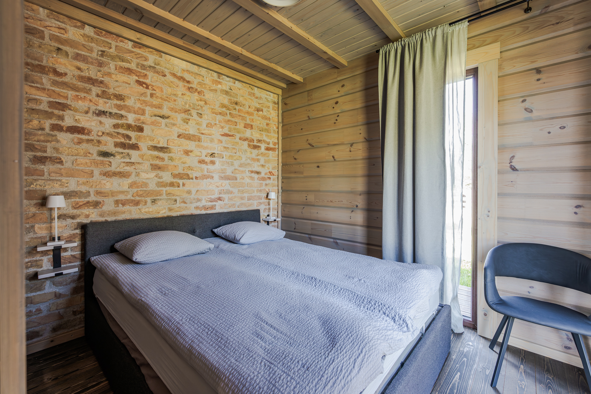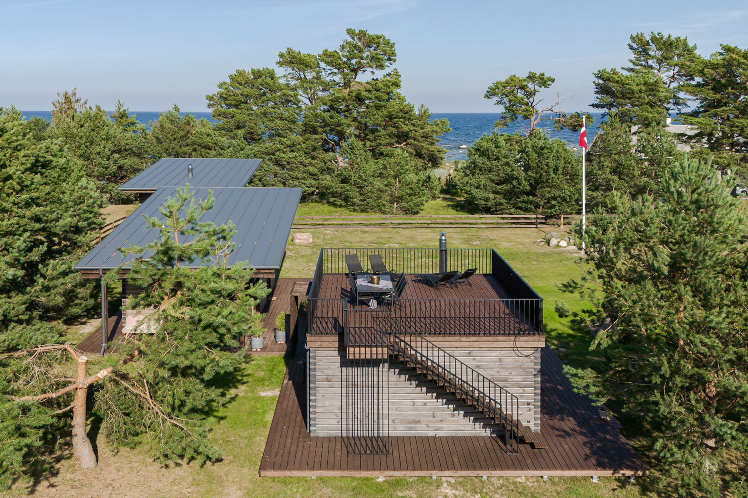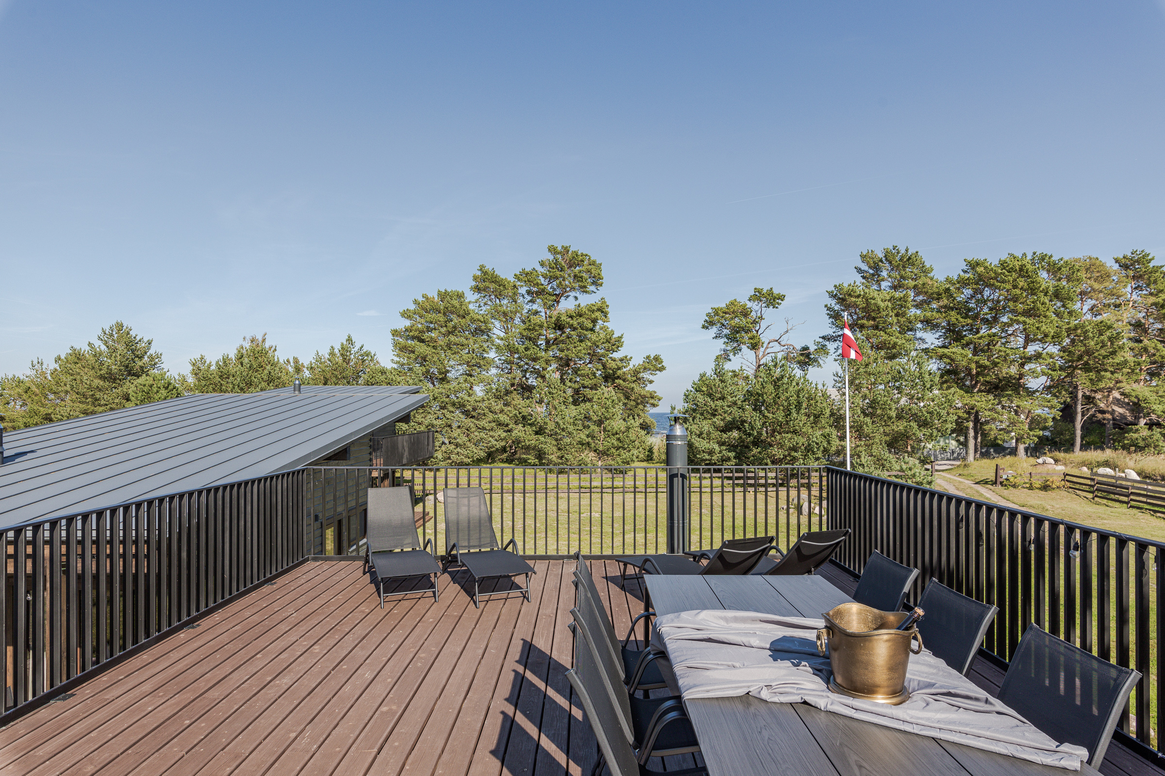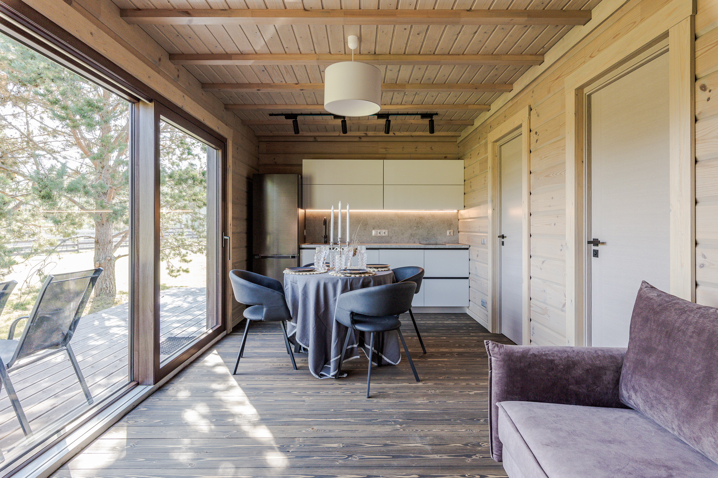 The home has a spacious living and dining area with a fully equipped kitchen and two bedrooms. Elegant sliding doors open onto a sun-drenched terrace.